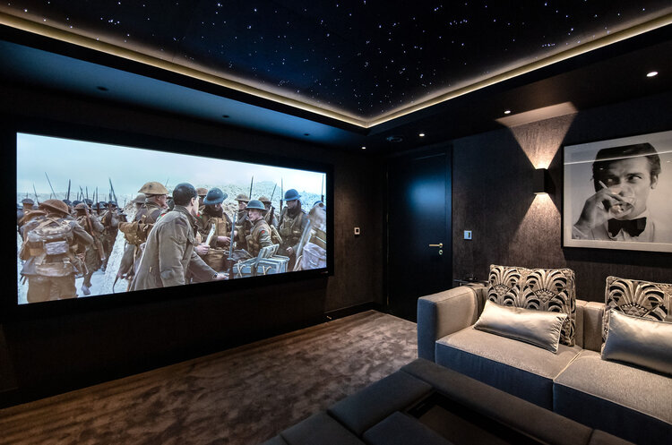 По задумке владельца, этот кинозал должен был быть уютным, гостеприимным и очень удобным. Дизайн комнаты и сделанный на заказ диван создают фантастическое ощущение в пространстве, побуждая всю семью сесть и вместе посмотреть фильм.