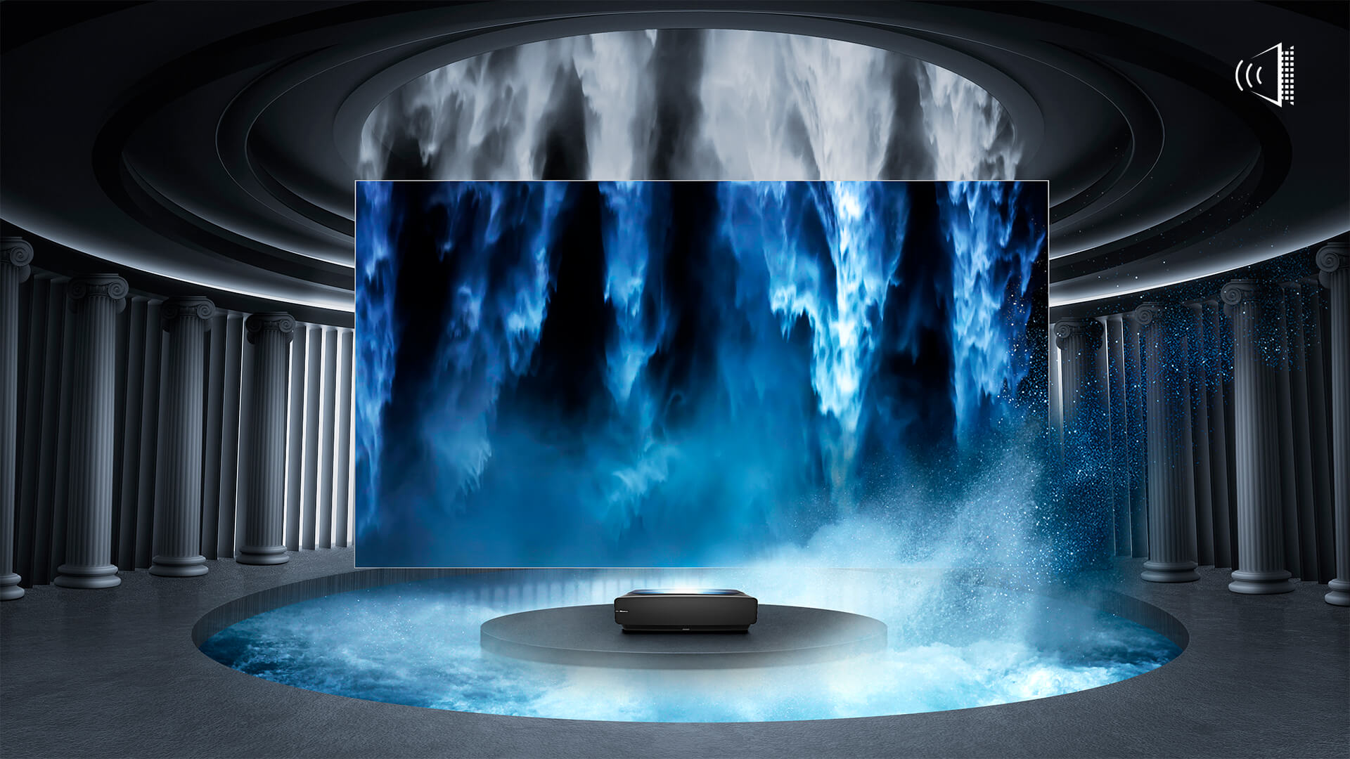 - Воспроизводящий звук с поверхности поляризационный ALR-экран Sonic Screen 88" с ультра-тонкой рамой 1.5см для UST-проекции, поглощает 85% внешней засветки, габариты 1972 х 1120 х 29 мм