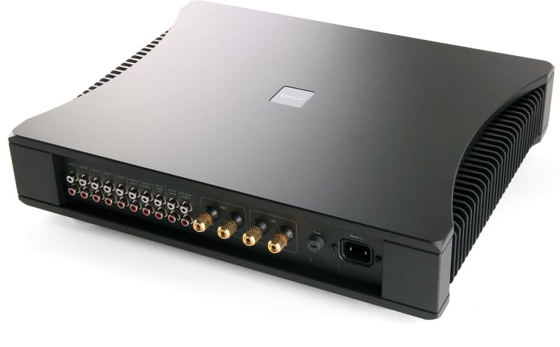 Созданный по схеме «двойное моно» интегральный усилитель с ПДУ, 2x125W. Моторизованный регулятор громкости, 6 входов, контроль магнитофона.
